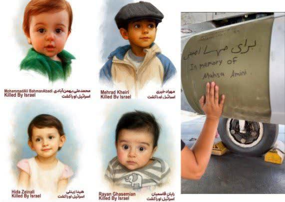 در این تصویر میبینید که روی موشک نوشته اسرائیل به نام مهسا امینی، کودکان و نوزادان ایرانی را به شهادت رسانده است: