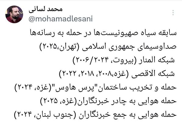 الان که جنگ دوازده روزه تمام شده و کلی فرمانده و دانشمند رده بالا و از اقشار مختلف شهید دادیم، از جمله ۱۲ نفر از اصحاب رسانه، همچنان نگران اصحاب رسانه هستیم که چرا که اسرائیل سو سابقه بلند بالایی در کشتار خبرنگاران و فیلم برداران دارد. او اصحاب رسانه را هدف قرار می‌دهد تا سرپوشی بر جنایاتش باشد و اصحاب رسانه را بخشی از اهداف نظامی ایران میداند.